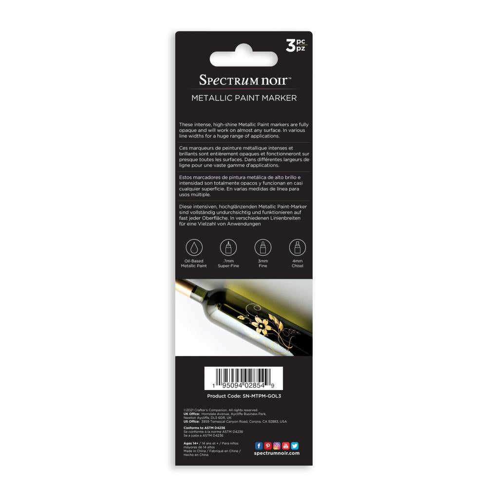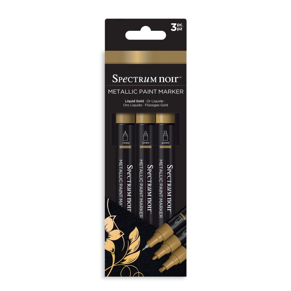 Spectrum Noir - Metallic Paint Marker - 3/Pkg - Liquid Gold. A new line of intense, high-shine opaque metallic markers in gold silver and copper. Use on paper, card, canvas, wood, metal, plastic, glass, ceramic and most surfaces. Each set includes: 3 Markers, 1 colour. With a .7MM Superfine Tip, 3MM Fine Tip AND 4 MM Chisel Tip for a huge range of applications. Available in a variety of colors. Each sold separately.