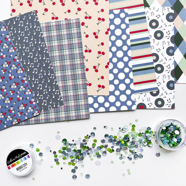 Catherine Pooler - Patterned Paper - Bobby Soxer. Let's dance the jive at the sock hop! The Bobby Soxer Patterned Paper is inspired by life and music of the 1940's. Tweed, tiny flowers and argyle socks- this paper pack has fabric and textile inspired patterns and music inspired prints! With a subtle color combo of Rouge, Matcha, Spruce, Stone Blue, Cove Blue, Buttercream, Hoodie and Slate.