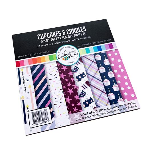 Catherine Pooler - Patterned Paper - Cupcakes & Candles. Patterned paper that is ready to celebrate- grab a pack of Cupcakes & Candles! This pack of 8 designs features a spa color combo of Sparkling Berry, Merlot, Clay Mask, Lemongrass, Juniper Mist and Serene. Featuring fun party patterns of candles and cupcakes as well as festive confetti and dots.