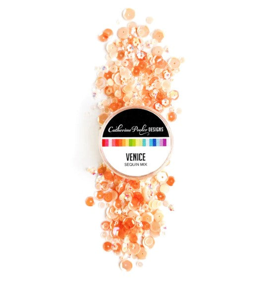 Catherine Pooler - Sequin Mix - Venice. Riding in a gondola along the canals of Venice, Italy is certainly romantic...as is the soft and pearly Venice Sequin Mix. This mix of pale peach and buttercream sequins is an opalescent and iridescent mix and includes some sweet little flower sequins. Venice was created to coordinate with the Roses & Lace Patterned Paper and is the perfect peach monochromatic mix.