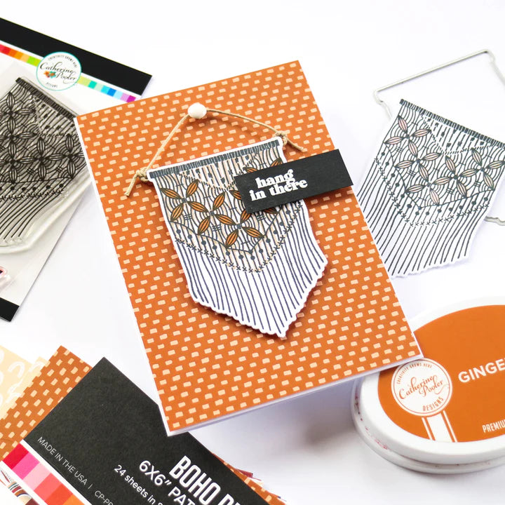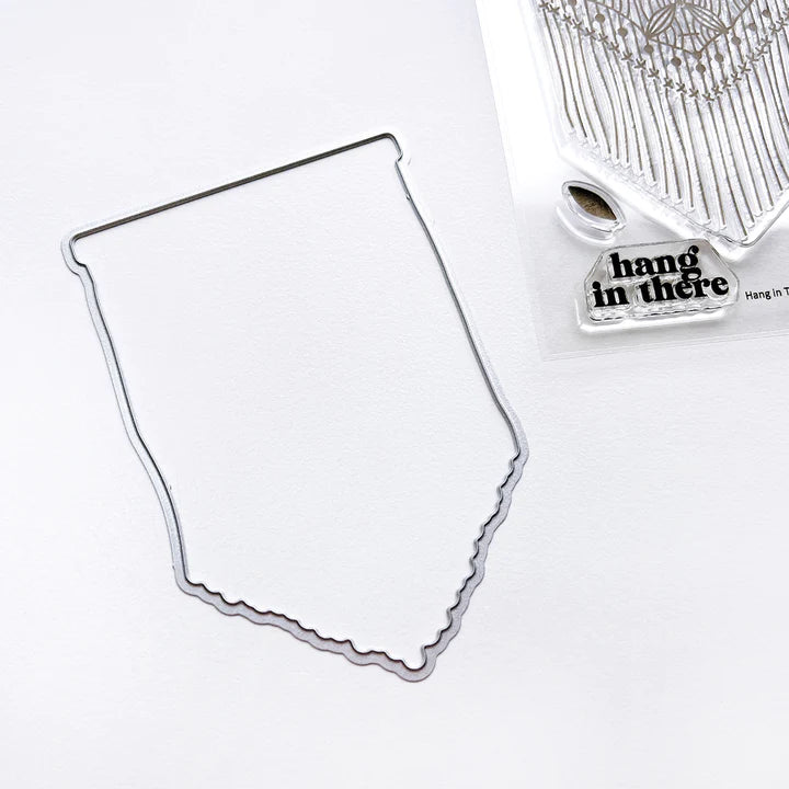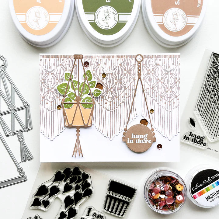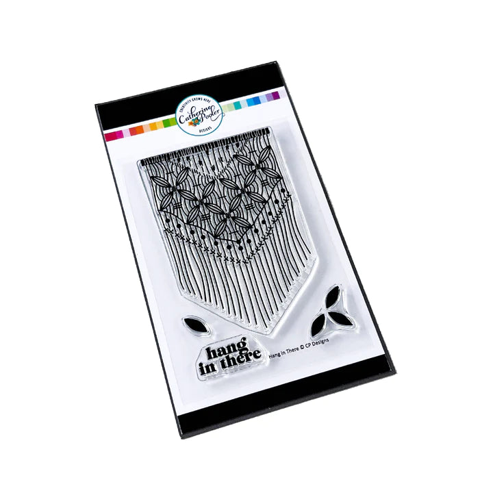 Catherine Pooler - Stamp & Dies Set - Hang in There. When you need to send a little encouragement, do it with the Hang in There Stamp Set. This 3x4 stamp set features a macrame wall hanging stamp and a tiny "hang in there" sentiment. The stamp set includes petal shaped stamps to fill in the image with color or you can ink it up in a mix of colors for more fun. Use the coordinating Hang in there dies and hang it on your card for a nice bit of dimension.