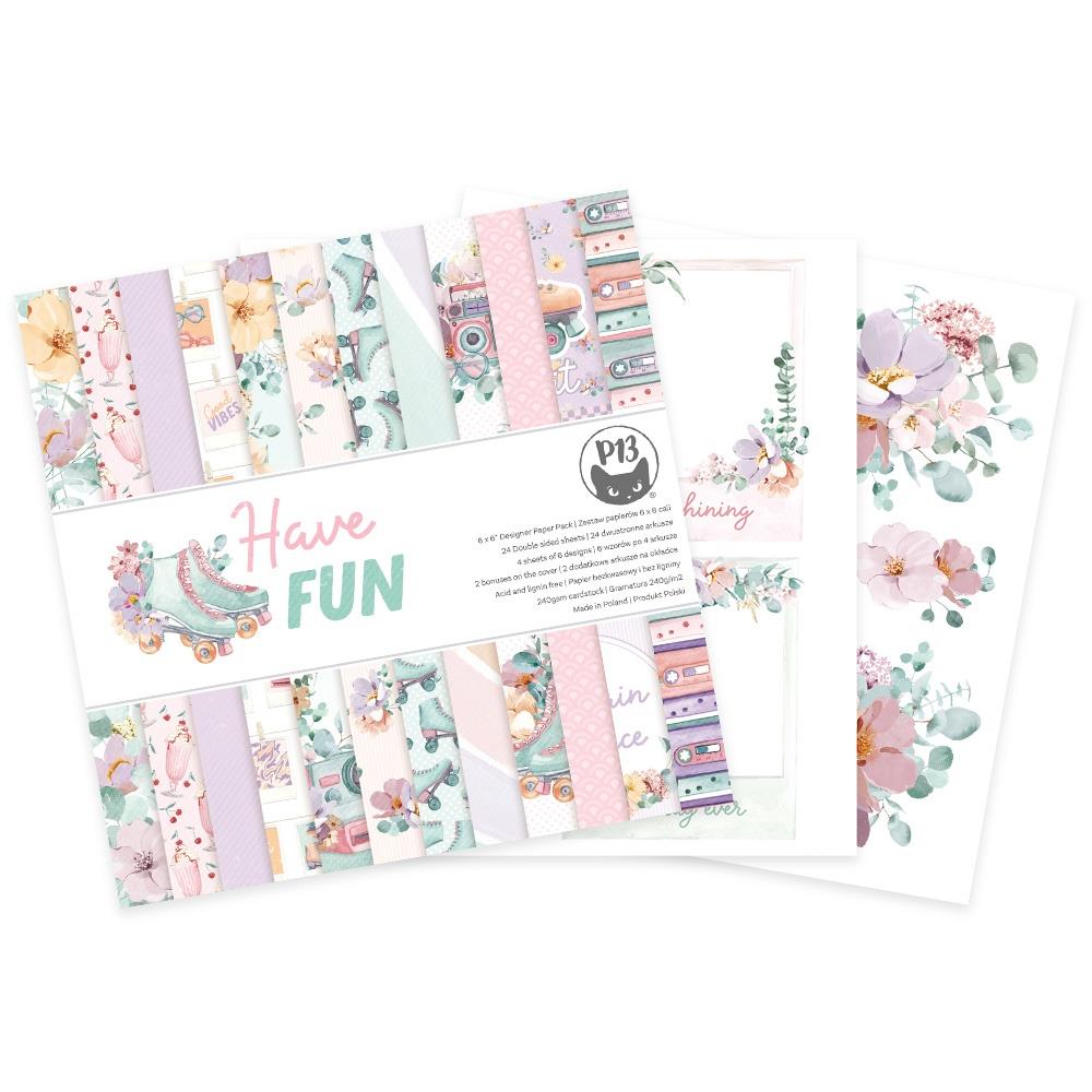 P13 - Double-Sided Paper Pad 6"X6" - 24/Pkg - Have Fun. The perfect start to all your paper crafting projects! This package contains twenty four 6x6 inch double-sided sheets in six different designs (four of each), plus two additional designs on the covers. Acid and lignin free. Paper weight 240 gsm. Imported.