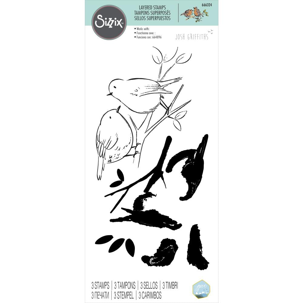 Sizzix - Layered Clear Stamps By Josh Griffiths - Garden Birds. Watch these two content characters perched on their branch come to life as you use this Layered Stamp set. Change the colours to create different kinds of birds for all year round, from a springlike scene, to red robins for winter makes. Pair with the Sizzix Stencil & Stamp Tool for accurate position and precision, every time!
