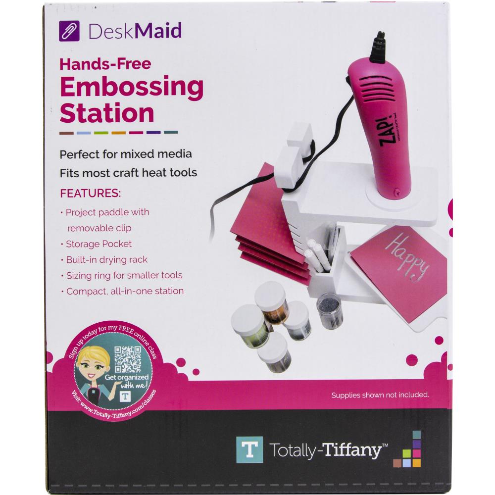 Totally-Tiffany - Embossing Station Hands-Free. A hands-free heat tool holder, plus project clipboard, built-in cooling rack, and tool pocket, combine to make this your new must-have item for all your embossing and mixed media projects. This 9.25x11.75x4.5 inch package contains one project paddle with removable clip, one storage pocket, built-in drying rack and sizing ring for smaller tools. Imported.